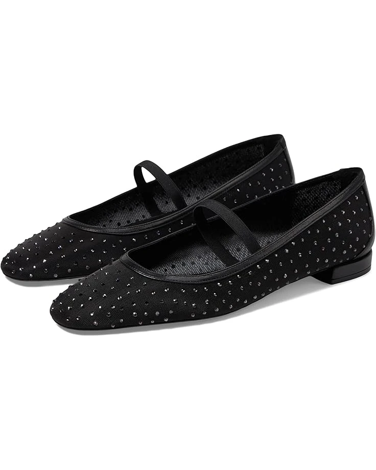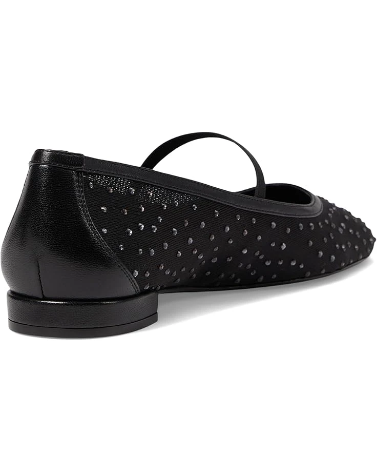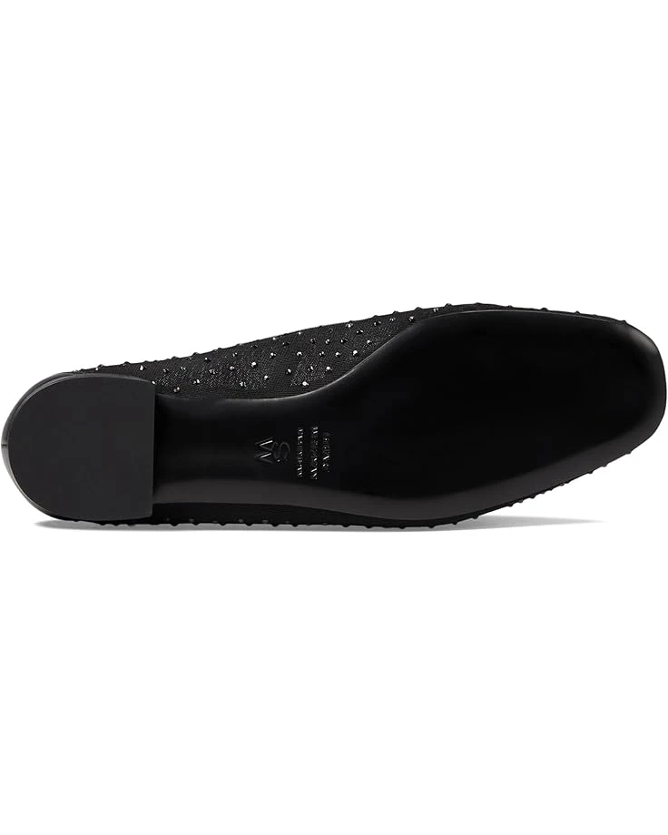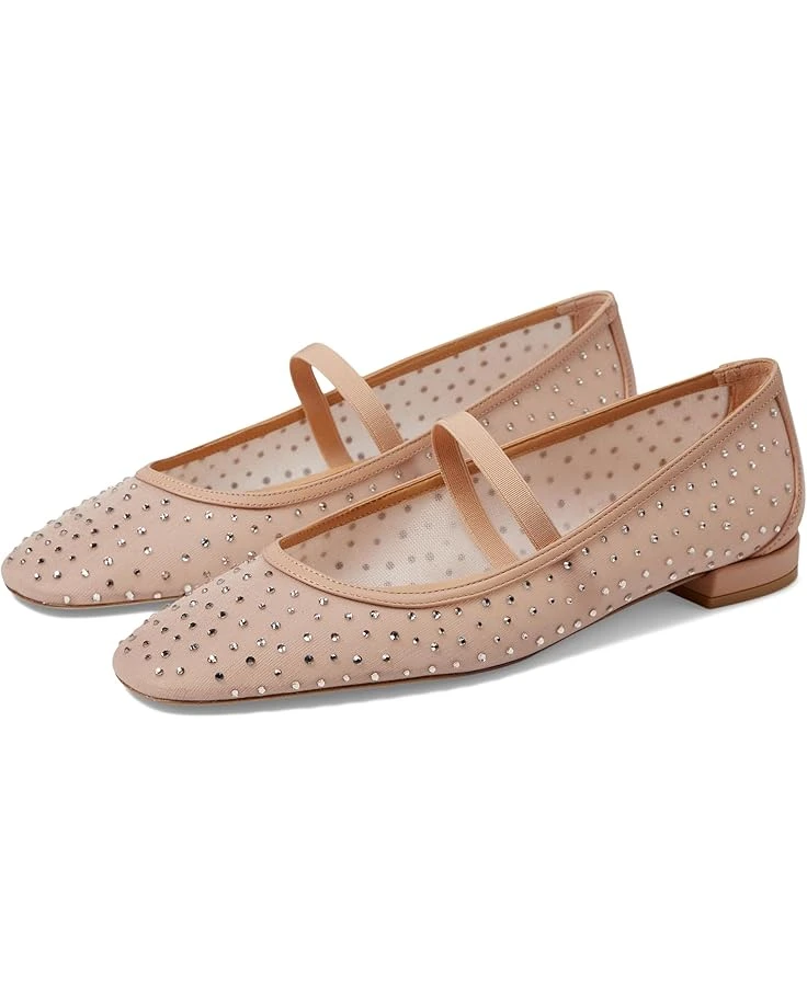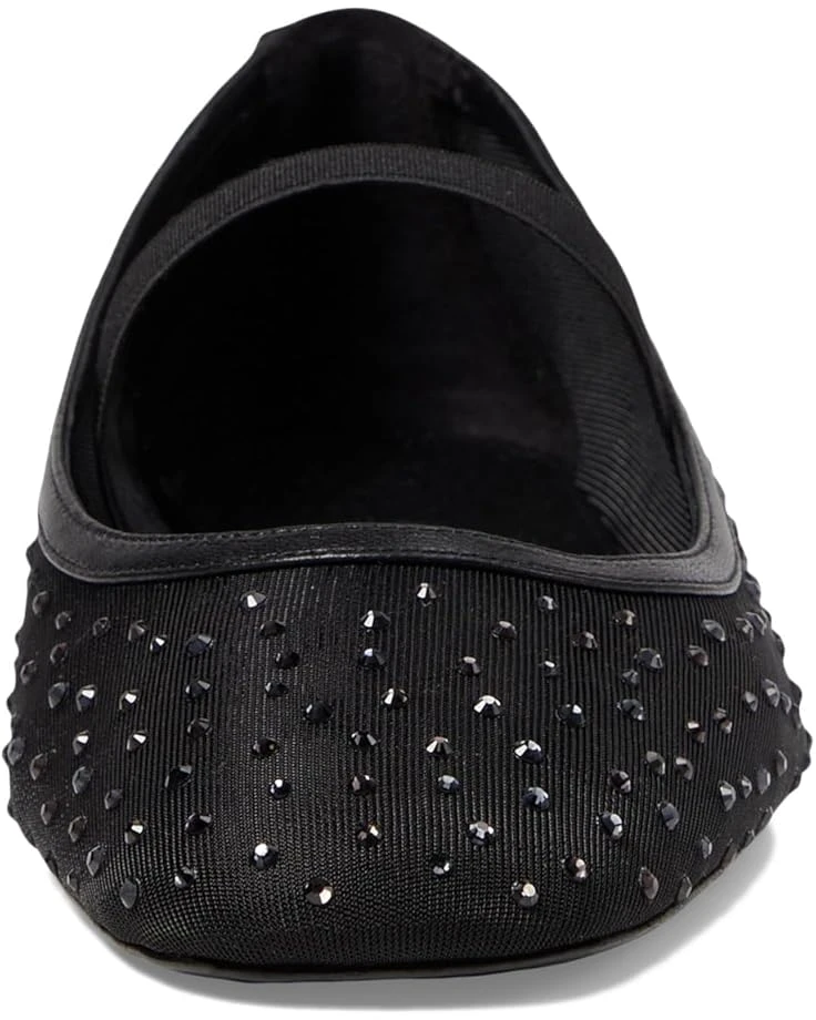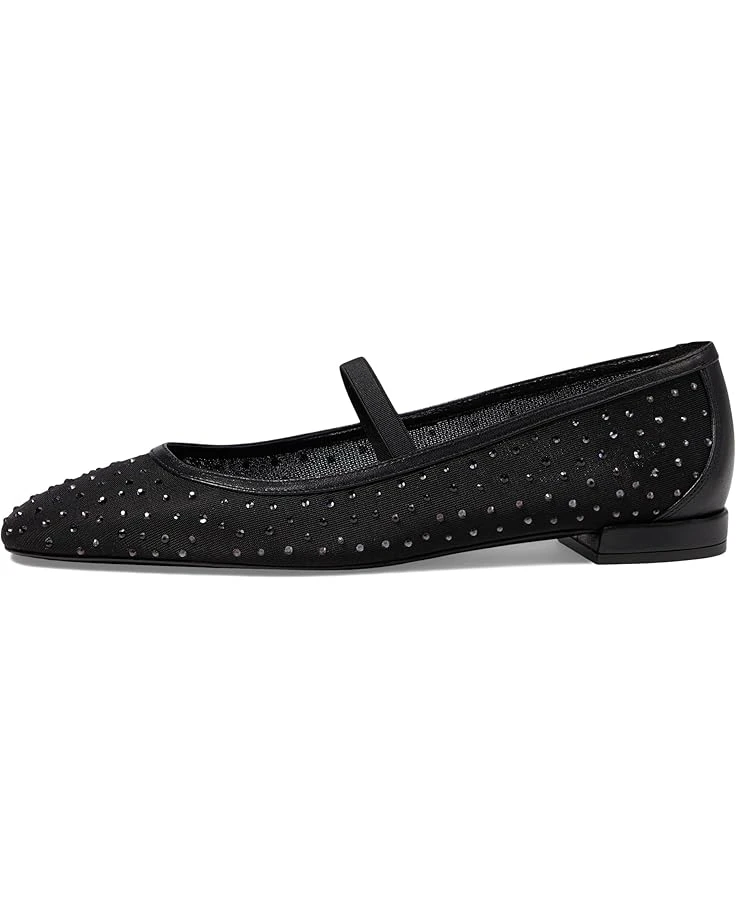 - Rhinestone studs bring a glamorous hint to the astounding beauty of Stuart Weitzman® Arabella Flats. The pull-on footwear features leather upper construction with square toe silhouette and elasticized midway strap for a secure fit.