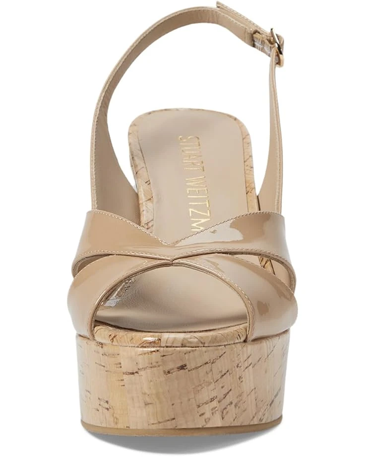 - Get a perfect blend of trendy style and comfort wearing Stuart Weitzmanยฎ Carmen Wedge sandal. It features coat leather and patent polyurethane coated calf leather upper. A TPU lining with synthetic rubber insole ensure enhanced comfort for feet. The sandal has open toe, strappy vamp with adjustable slingback strap and buckle closure. A wedge heel adds a touch of modern look when you wear the sandals with pants or midis.