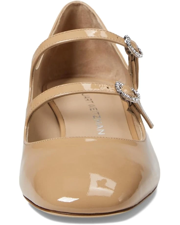 - Make a lasting impression donning Stuart Weitzman® Claris Mj 35 Pump! Featuring a chic round toe and trendy dual buckle closure, this shoe combines style with supreme comfort. The mestizo leather lining and EVA insole provide a luxurious feel, while the patent PU-coated calf leather upper ensures durability and shine. The cow leather outsole offers unmatched stability.
