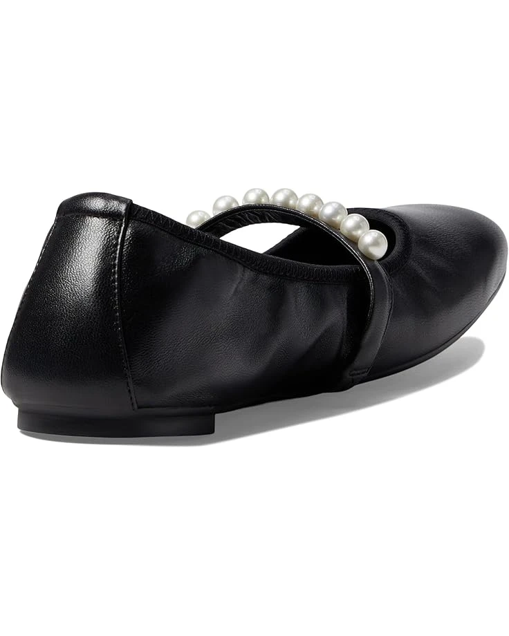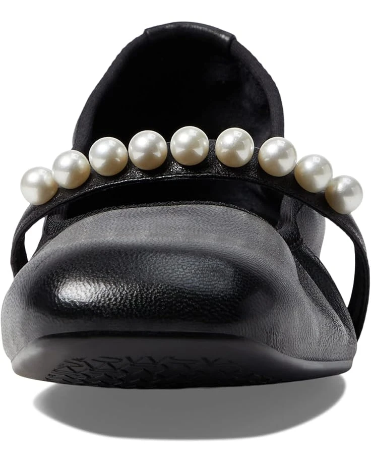 - Shiny leather upper with signature pearl embellishments on the vamp strap.