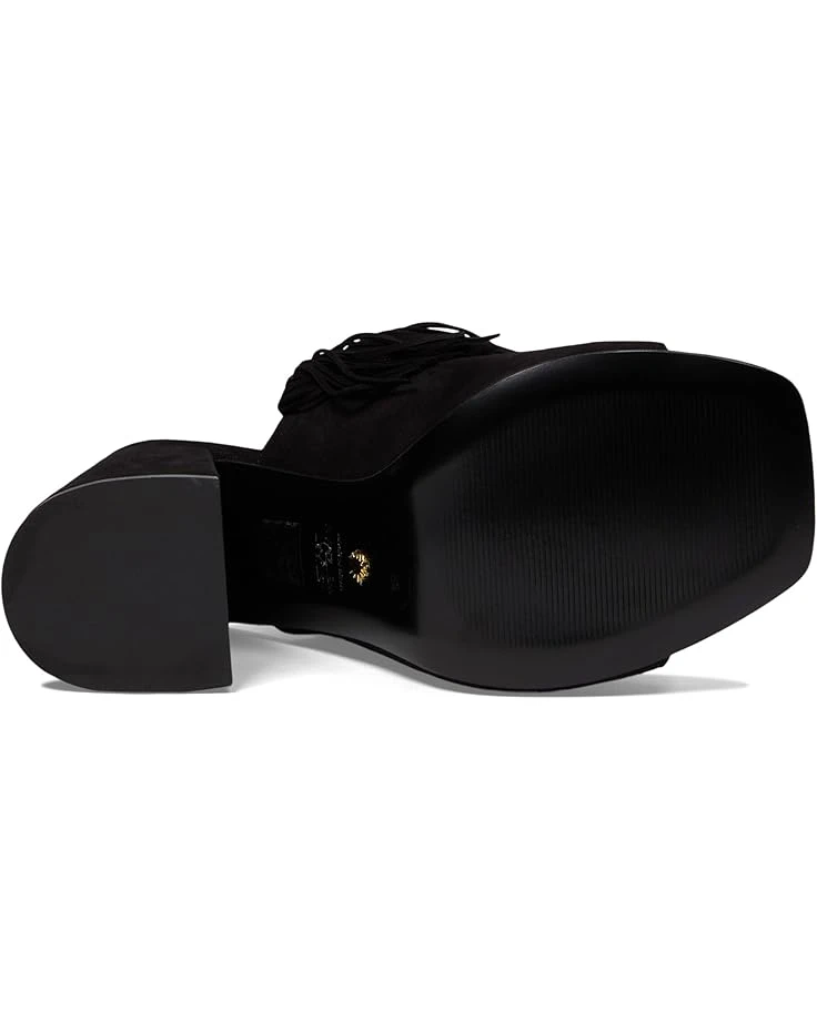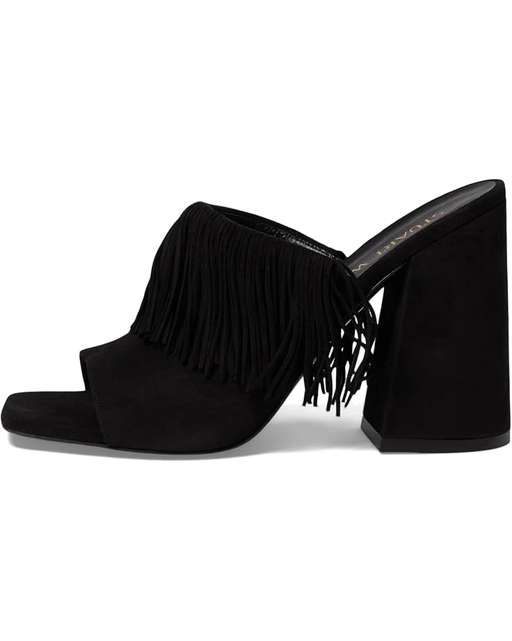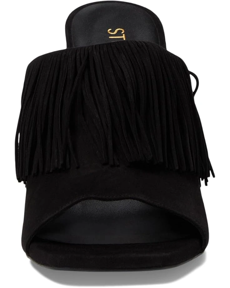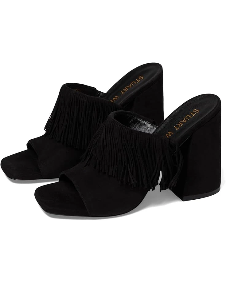 - Walk into a world of chic sophistication with Stuart Weitzman® Tia Fringe 100 Slide. Elevating the best-selling open square-toe design, this sandal boasts a fashion-forward fringe detail for a textured twist. Expertly crafted by SW artisans, the flared block heel ensures unparalleled comfort with its wider base.